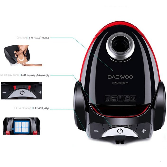 جاروبرقی Daewoo مدل DVC-LH22 با توان موتور ۲۱۰۰ وات و قدرت مکش ۶۵۰ وات، انتخابی عالی برای نظافت کامل خانه است. این دستگاه کیسهدار با فیلتر بهداشتی HEPA 13 و طراحی ارگونومیک، محیطی عاری از گردوغبار برای شما فراهم میکند. طول سیم ۸ متر و شعاع کارکرد حدود ۱۱ متر، جابهجایی آسان را به همراه دارد. بدنه مقاوم، صدای کم و نشانگر دیجیتال پر بودن کیسه از دیگر مزایای آن هستند