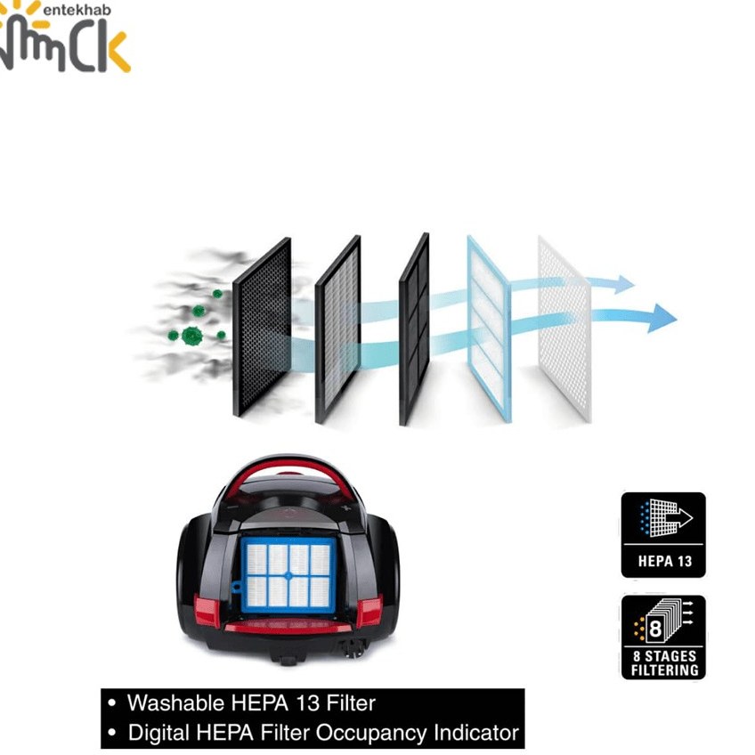با توان مصرفی ۲۱۰۰ وات، طراحی مدرن و امکانات کامل، انتخابی ایدهآل برای نظافت کارآمد منزل است. این دستگاه با قدرت مکش بالا (حدود ۶۵۰ وات) و قابلیت تنظیم سرعت مکش، توانایی جذب کامل گردوغبار، مو و ذرات میکروسکپی را دارد. سیستم فیلتراسیون چندمرحلهای با فیلتر HEPA 13، محیطی سالمتر و فاقد گردوغبار ایجاد میکند. طول سیم ۸ متر و شعاع کارکرد حدود ۱۱ متر، جابهجایی آسان در فضای خانه را ممکن میسازد. وزن معادل حدود ۶.۵ کیلوگرم، لوله تلسکوپی و نشانگر دیجیتال پر بودن کیسه، از دیگر ویژگیهای کاربرپسند این مدل هستند.